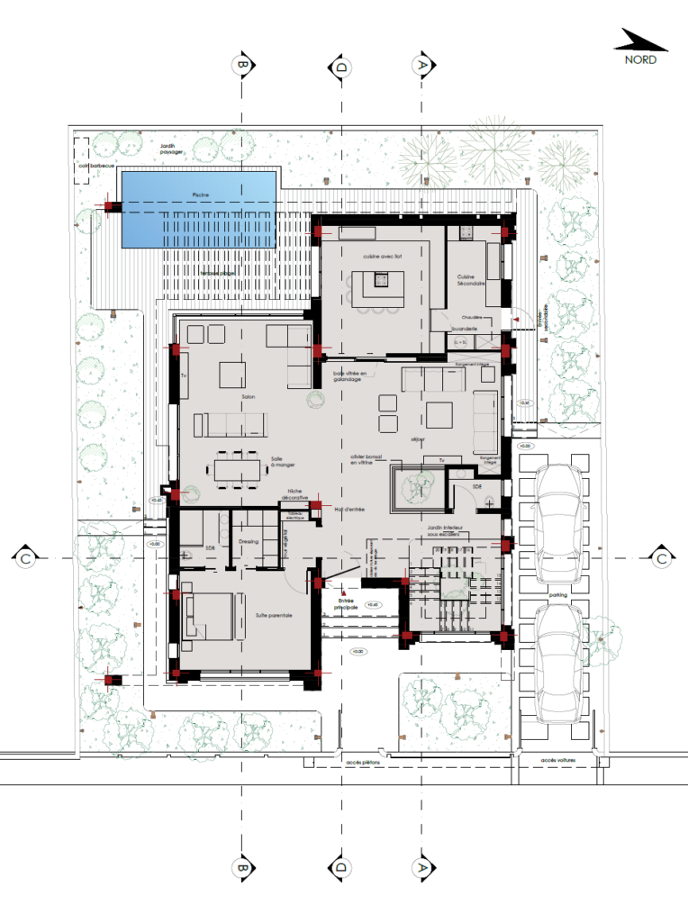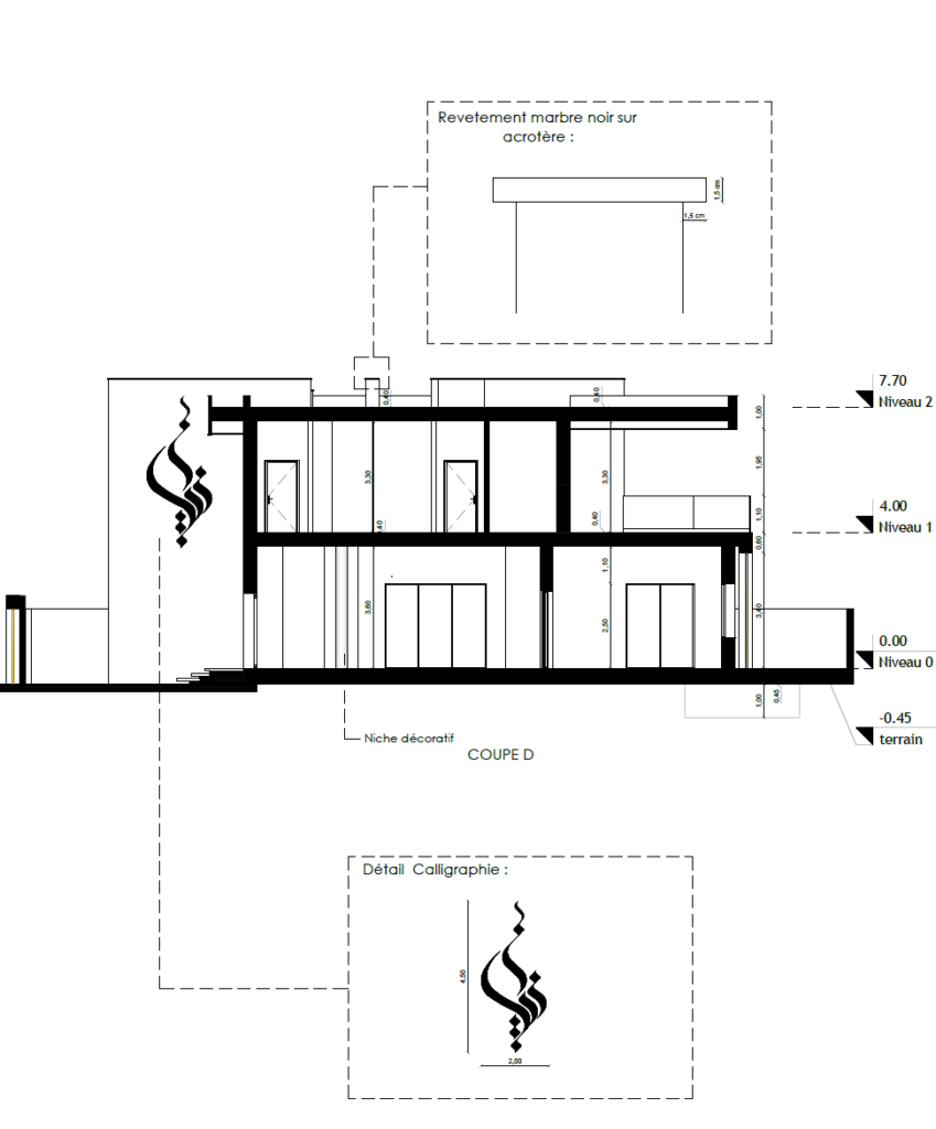 Les volumes s’organisent autour d’une écriture claire, rythmée par des arches, des verticalités affirmées et des encadrements lumineux qui soulignent l’architecture et accompagnent les usages, de jour comme de nuit. L’intention est de créer une villa à la fois lisible, élégante et performante, où chaque espace s’ouvre naturellement vers l’extérieur, tout en conservant intimité et confort. La matérialité, sobre et contrastée, renforce cette recherche d’équilibre entre modernité et chaleur, pour offrir un cadre de vie contemporain, durable et parfaitement adapté aux exigences actuelles.